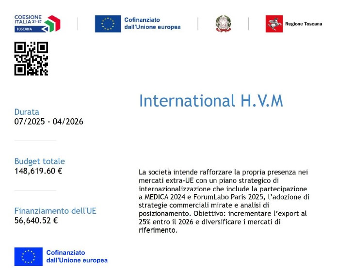 FINANZIAMENTI E AGEVOLAZIONIHVM di Livorno è attualmente attiva con tre progetti di sviluppo ed espansione grazie al finanziamento dal Fondo Europeo di Sviluppo Regionale (FESR)BANDO INTERNAZIONALIZZAZIONE 2025 E INTERNAZIONALIZZAZIONE EXPO OSAKA 2025